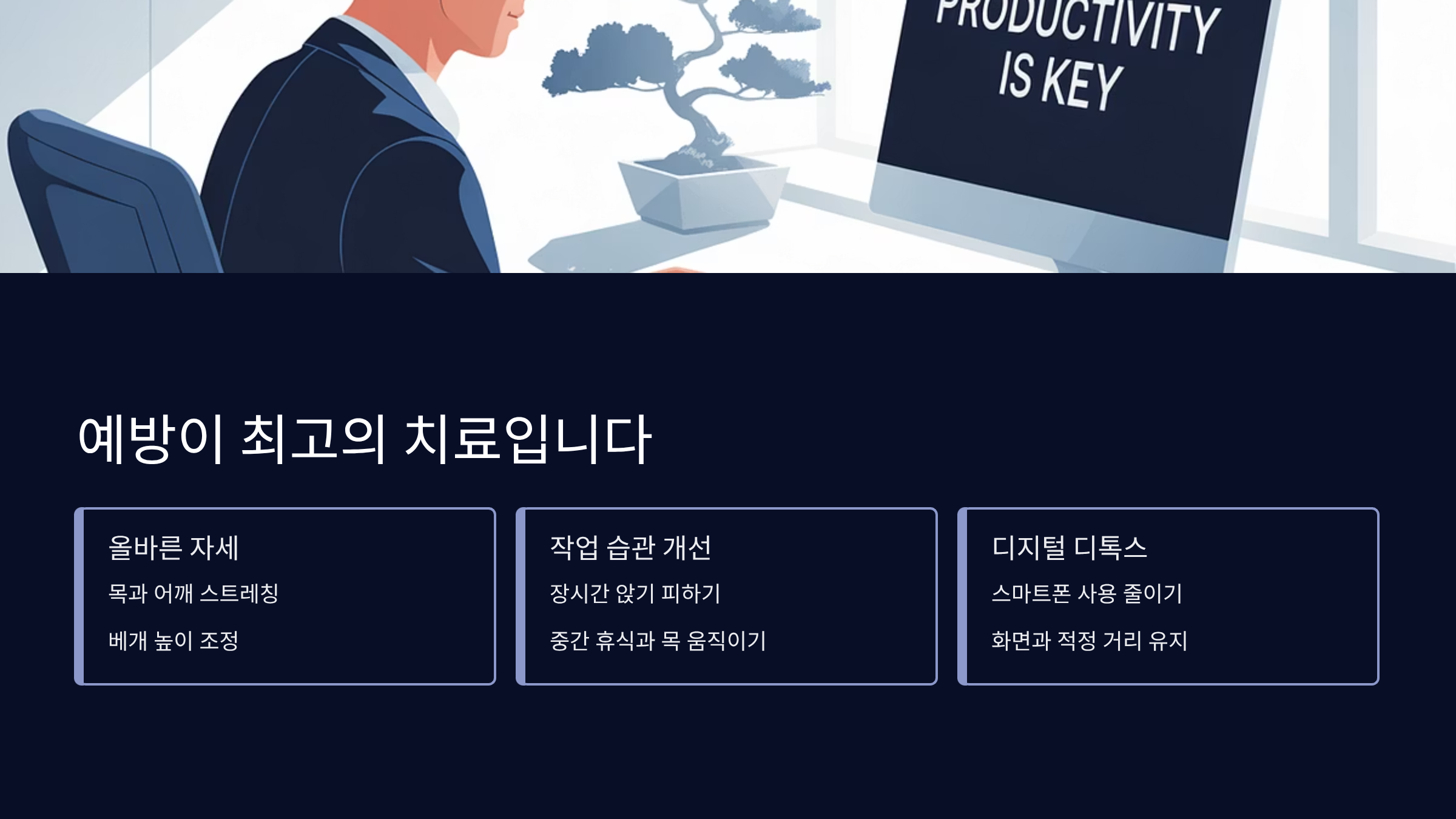 - 생활습관 개선: 장시간 같은 자세 피하기, 스마트폰 사용 줄이기