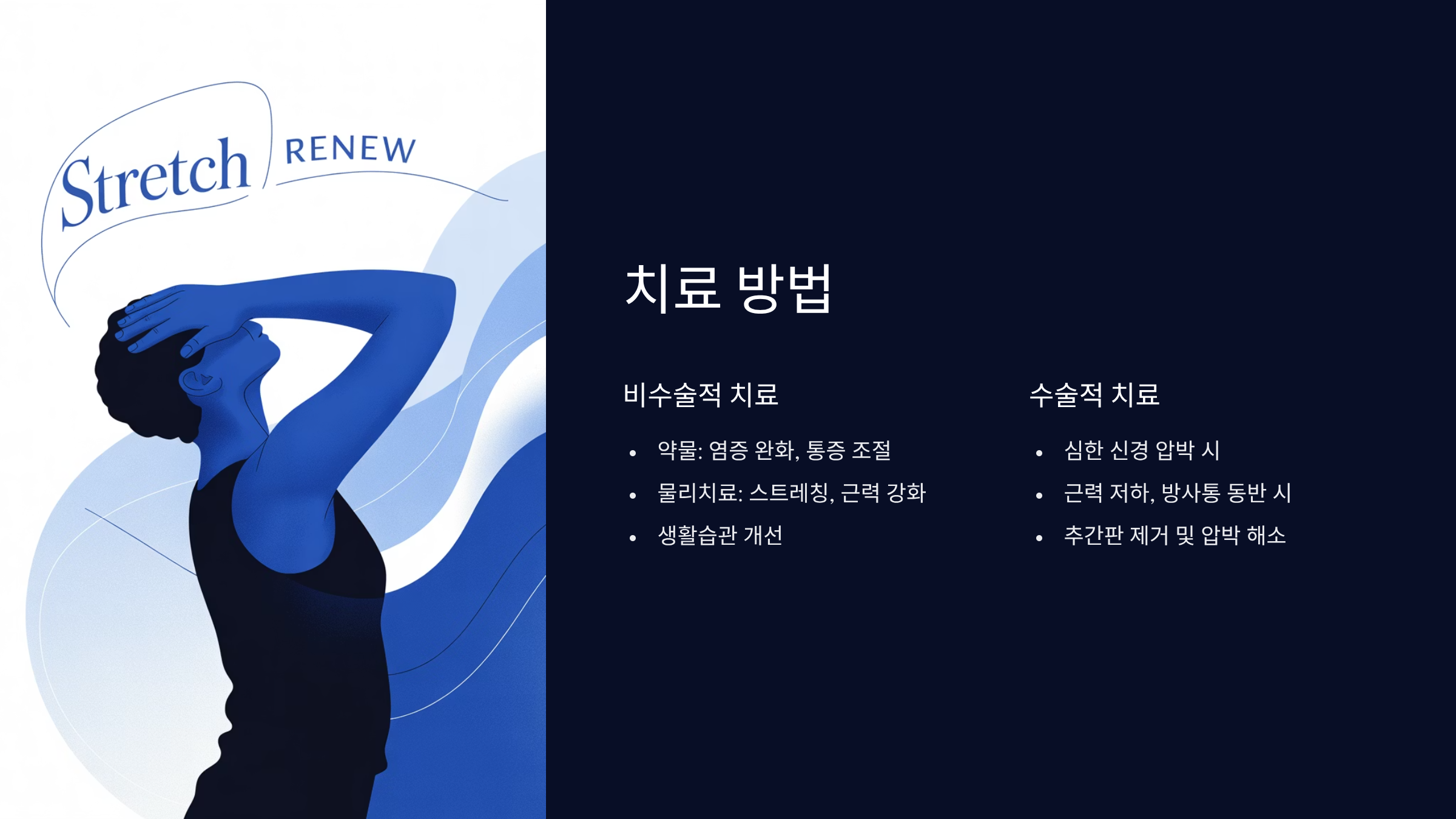 - 물리치료: 스트레칭, 근력 강화, 자세 교정