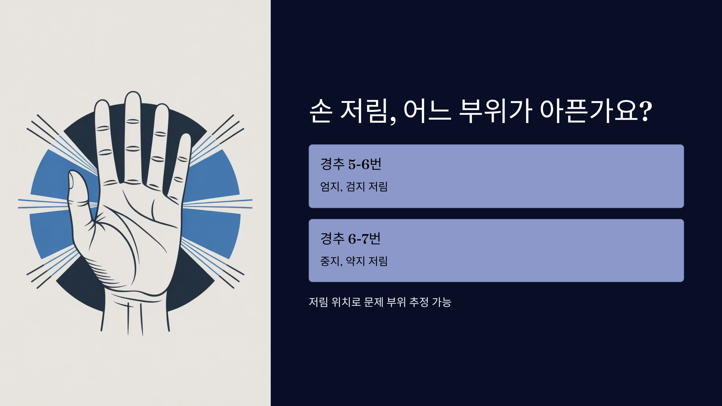 - 손 저림 위치, 통증 패턴, 방사통 여부 확인